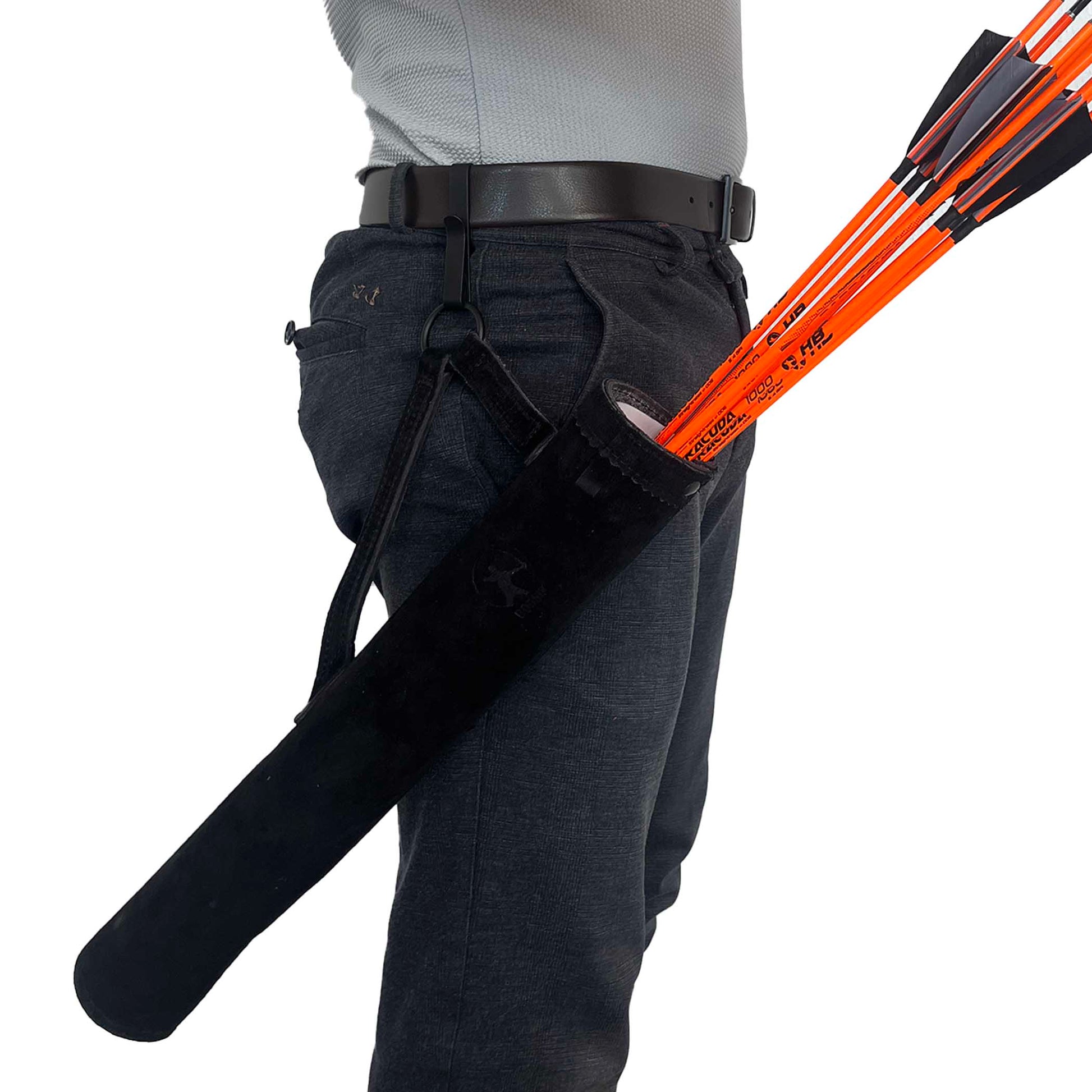 Dies ist der Archer´s Empire KAYA Seitenköcher aus Wildleder. Der Köcher lässt sich mühelos am Hosenbund befestigen und eignet sich somit gleichermaßen für Links- und Rechtshandschützen. Mit seinem schlichten Design ist er ideal für traditionelle Bogenschützen. Dank des Seitenköchers lassen sich die Pfeile besonders komfortabel entnehmen, sodass aufeinanderfolgende Schüsse mühelos und schnell möglich sind.